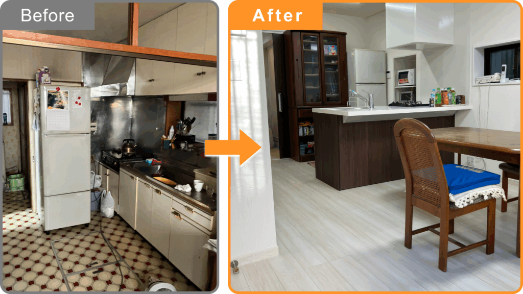 O様ご夫婦がのんびりと快適に過ごせるよう、マンション2部屋をつなげるリフォームをご依頼いただきました。O様が一目惚れした鮮やかなオレンジのキッチンや、ご実家から受け継いだシャンデリアなど、こだわりを随所に取り入れて温もりと個性あふれる空間が完成し、お喜びの声をいただきました。