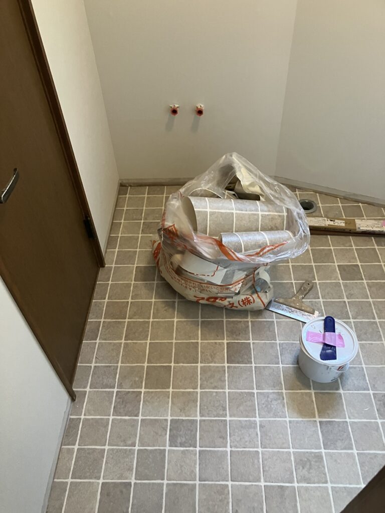 現在の洗面化粧台を撤去して、壁・天井のクロスと床のクッションフロア貼り替えました。