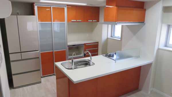 O様ご夫婦がのんびりと快適に過ごせるよう、マンション2部屋をつなげるリフォームをご依頼いただきました。O様が一目惚れした鮮やかなオレンジのキッチンや、ご実家から受け継いだシャンデリアなど、こだわりを随所に取り入れて温もりと個性あふれる空間が完成し、お喜びの声をいただきました。