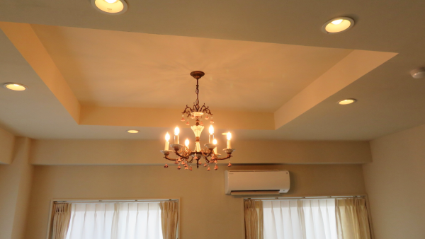 メインの照明にO様がご実家から持ってきたシャンデリアを使いたかったので、折り上げ天井にしています。ちょっと古いマンションですが、スラブいっぱいまで上げることで、圧迫感もなく、落ち着いた感じにできました。シャンデリアは一生懸命みがきました。
