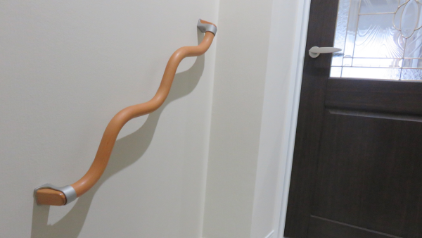 玄関で靴を脱いで、お部屋に上がる段差の横につけました。くねくねした手すりは段差を登る時と、降りる時の力のかかり方を考えられた形状です。とても使いやすい手すりと好評です。