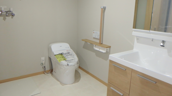 洗面とトイレを1室にし、入口は引戸です。将来的に車いすでも出入りが可能な広い開口が取ってあります。