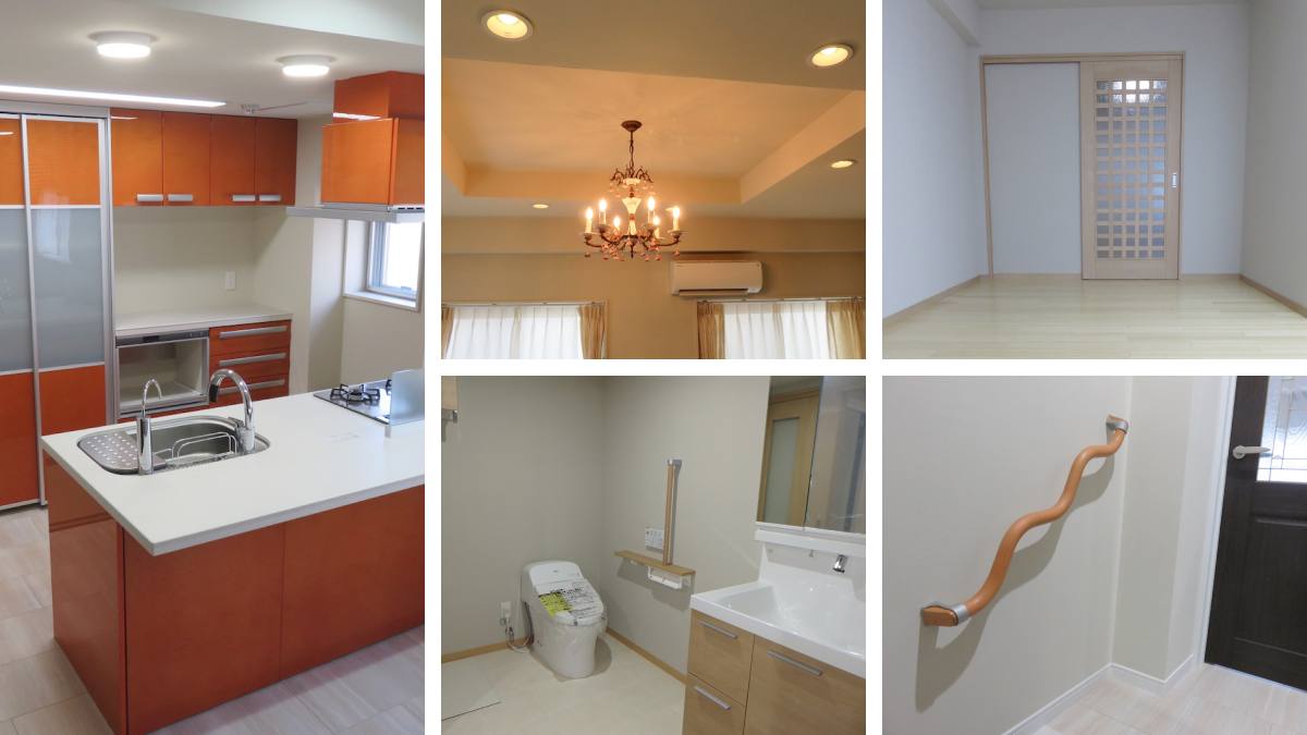 O様ご夫婦がのんびりと快適に過ごせるよう、マンション2部屋をつなげるリフォームをご依頼いただきました。O様が一目惚れした鮮やかなオレンジのキッチンや、ご実家から受け継いだシャンデリアなど、こだわりを随所に取り入れて温もりと個性あふれる空間が完成し、お喜びの声をいただきました。